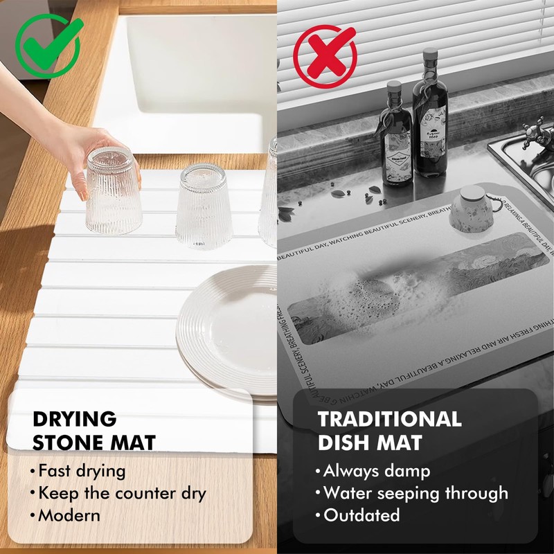 - Quick Drying, Water Absorbent: Made from premium food-grade diatomaceous earth, this large stone dish drying mat absorbs water and dries quickly, keeping your kitchen countertops or bathroom surfaces dry and odor-free.