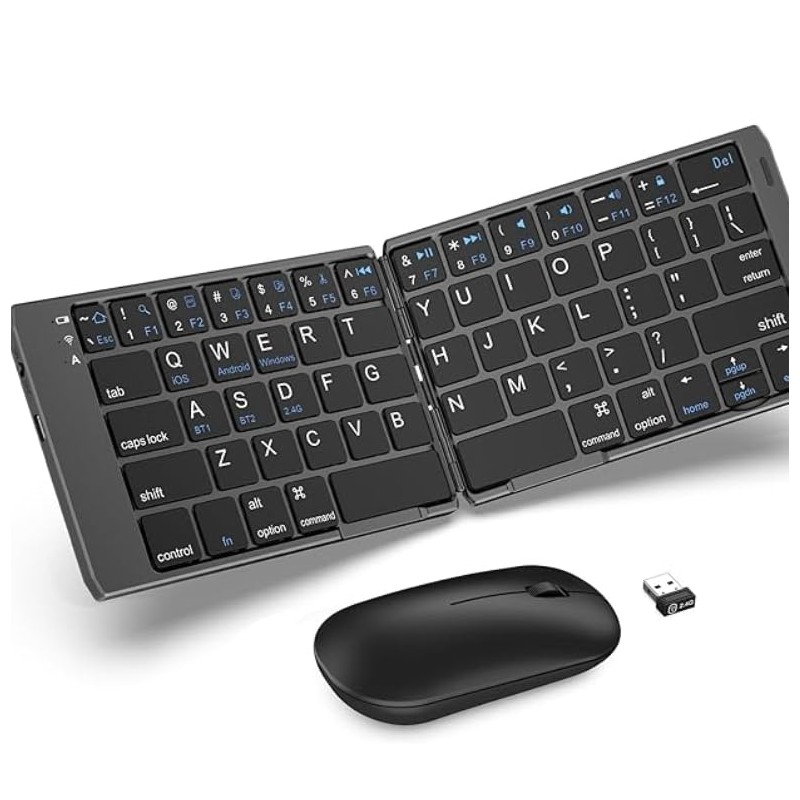 Foldable Keyboard and Mouse, 2.4G Wireless+Dual Bluetooth5.0 Folding Keyboard & Mouse Combos for Business and Travel, USB-C Rechargeable Portable Keyboard Mouse for iPads, Phones, Tablets-Black
