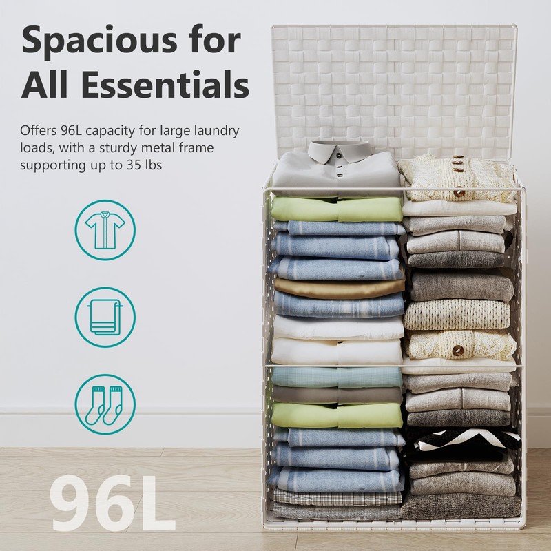 Foldable Laundry Hamper Basket with Lid by Fiona's magic, Handwoven 96L Large Clothes Hamper with Removable Liner Bags, Collapsible Tall Hamper for Bedroom, Bathroom and Dorm Organizer, 2Pack, White