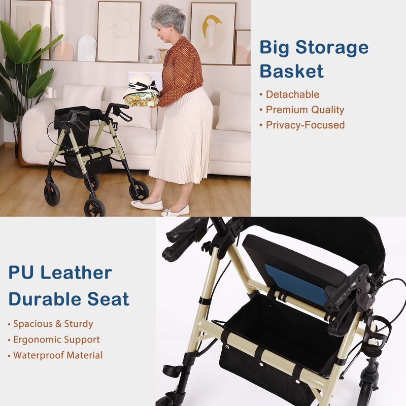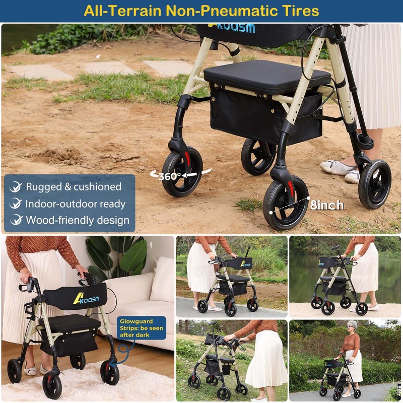 Foldable Rollator Walker with Seat for Seniors - Lightweight Rolling Walkers with Brakes, 300 lb Capacity, 8" All-Terrain Wheels, Adjustable Handles and Seat Height & Removable Storage Bag, Champagne