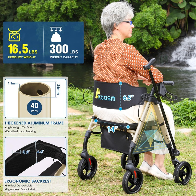 - 【THICKER AND WIDER SEAT & BACKREST】Akoasm lightweight walkers for seniors has a waterproof PU seat with solid wooden board & high-density foam – We have widened and thickened the backrest to effectively reduce the pressure on the user's back during use. *Includes storage basket & anti-slip cup holder & walking stick rack*