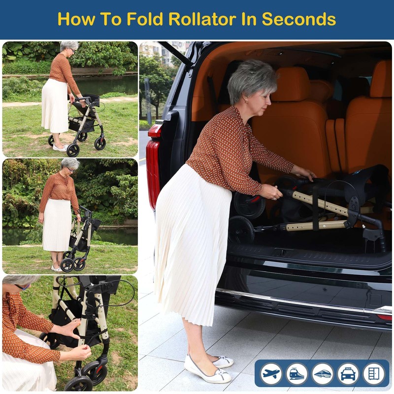 - 【EASY FOLDING & ASSEMBLE & STORE】All-terrain folding rolling walkers requires no tools for quick assembly and can be folded in seconds with a dedicated locking mechanism to ensure stability. This addresses a common issue with other adult walkers for seniors that often lack stability when folded, making it easy to fit into your car trunk