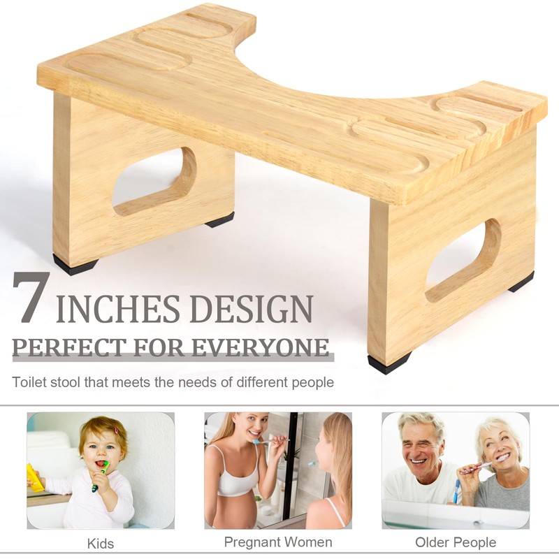 - It’s safe to use with or without shoes depending on your comfort needs. Measures 17"(Long) X 9.6"(Wide) X 7"(High). It has non-slip safety treads and 350 lbs weight capacity.wood squatty potty.toilet squat stool