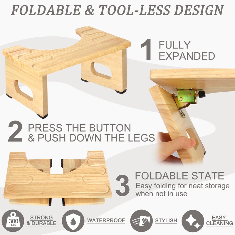 - Non-installation and collapsible design - Before use, directly pull out of the bamboo toilet stool leg. When don’t need, long press the button to fold the leg. Saving your installation time and bathroom space.toilet stool,poop stool,bathroom stool,poop stool adult
