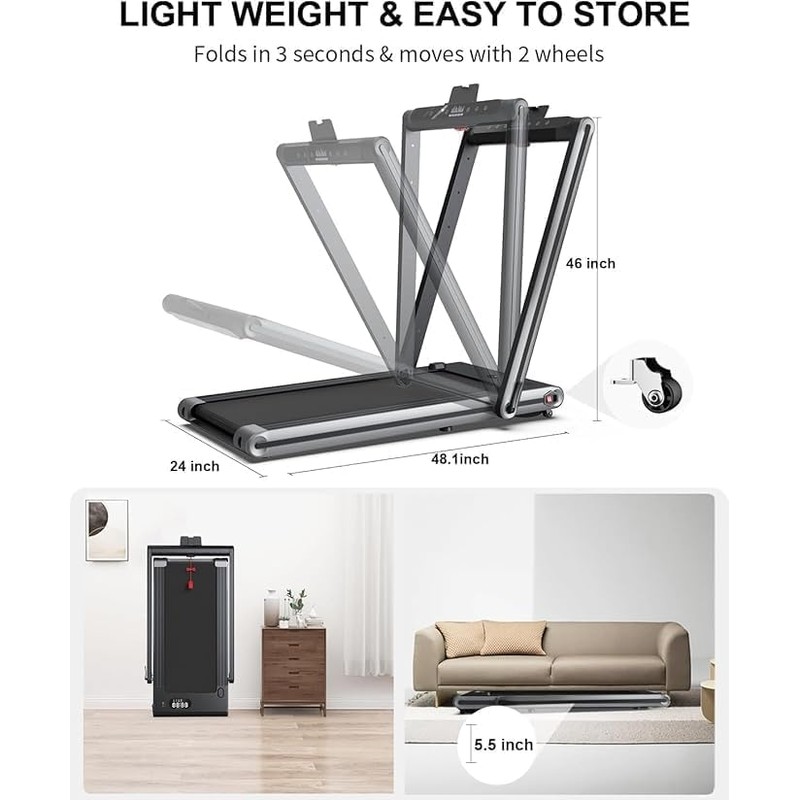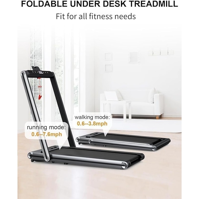 - Versatile 2-in-1 Foldable Treadmill:This folding treadmill offers dual workout modes,with speeds ranging from 0.6 to 7.6 mph.In walking mode(with the riser folded),it's perfect for under-desk use at speeds from 0.6 to 3.8 mph.When the handrail is raised,it transforms into a full treadmill with incline,supporting speeds up to 7.6 mph.You can also adjust the incline treadmill to a 3% incline for a more challenging workout,enhancing fat burning