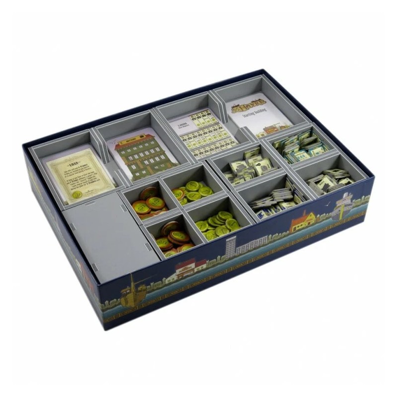 Insert compatible with Le Havre�� and the Le Grand Hameau�� expansion. The design provides both efficient storage and improved game play. The trays can be utilised during the game, and they greatly aid set-up and clear-away times. The rules and boards act as a lid on top of the trays. This product consists of a flat-pack of 6 Evacore sheets. The trays require assembly, which is quick and fun, using ordinary PVA glue. Detailed instructions are included in the package. Note: Insert designed for game with external box dimensions of 22.6 x 31.7 x 7.2 cm.