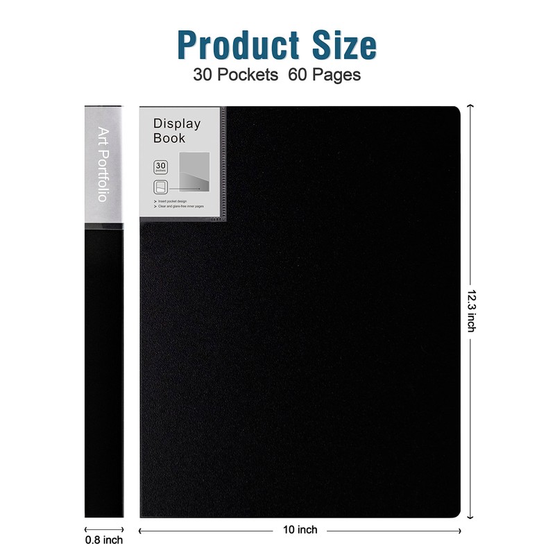 Folder plastic inner pages hold dimensions 9.5" x 12" and display 60 viewable pages 9 x 12" inches or smaller