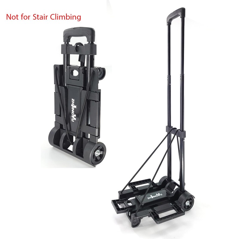 - OPENED AND FOIDED SIZE : The Height of Trolley Dolly Rod is 0.96 Meters, and the Base of Trolley Cart has 3 Folding Brackets. Expand the Brackets to Increase the Base Area to 35*32cm, then the Wide Bottom Plate can Accommodate Larger Boxes or Goods. The Size of Portable Hand Truck is only 44*23*8cm when Folded, the Size is very Small, which can be Easily Carried in a Backpack or Handbag.