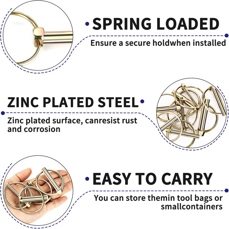 - High Quality Material The spring lock pin is made of high quality spring steel, and the surface is treated with zinc plating, which is rust and corrosion resistant and can be used for a long time.