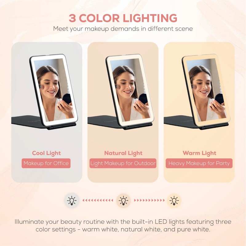 - - **3 Adjustable LED Colors** – Choose from warm white, natural white, or pure white light with customizable brightness for flawless makeup application.
