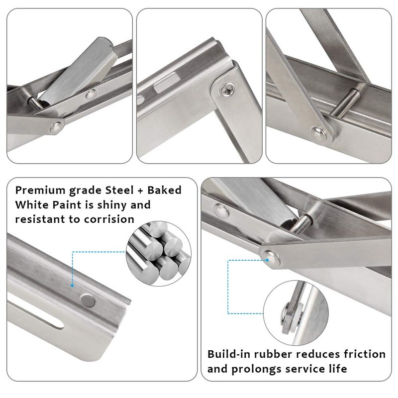 Toplimit Folding Shelf Bracket can make your home more clean and tidy after you place a piece of wood board on this Brackets.The collapsible brackets lock at 90 degrees. When you want to fold up the tables from the wall, just simply press the release arm.It helps keep your room organized and tidy, which is one of the perfect features of the folding brackets.