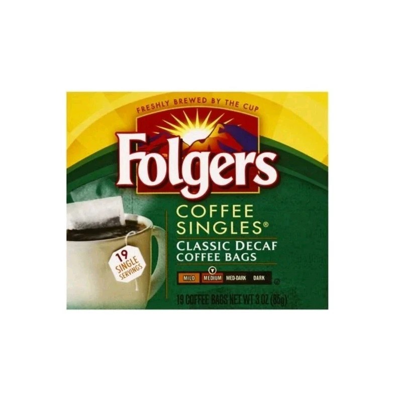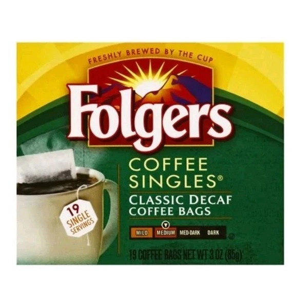 99.7% caffeine free. Makes up to 19 single servings. A Freshly Brewed Cup Every Time: Folgers Coffee Singles coffee bags are specially designed to brew right in your cup. Each single-serving coffee bag is made with 100% pure Mountain Grown coffee and individually wrapped for rich, flavorful taste and aroma. Enjoy the rich taste and aroma of Folgers wherever you are. Perfectly portable and easy to use, you can brew and enjoy a single cup of Folgers Classic Decaf coffee anywhere. At home, in your car, camping, at a picnic, wherever life takes you. A blend of ground and concentrated decaffeinated coffees. how2recycle.info. folgers.com. Questions? 1-800-937-9745. folgers.com.