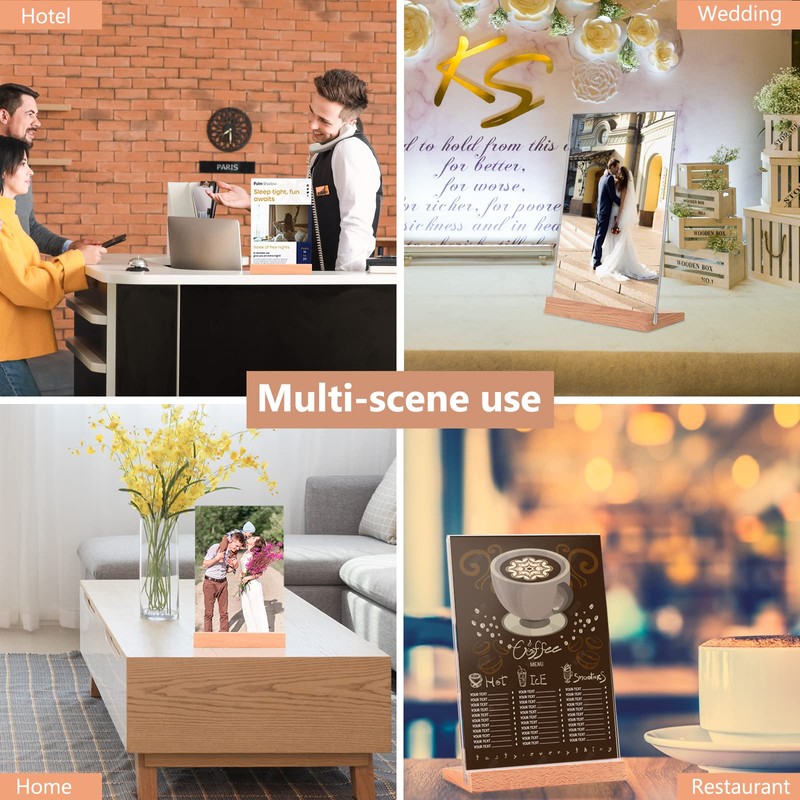 - 【L-shape appearance design】This acrylic sign holder has a beveled L-shape design. Equipped with adhesive strip, the wooden base is more stable and ideal for displaying pictures and announcements.