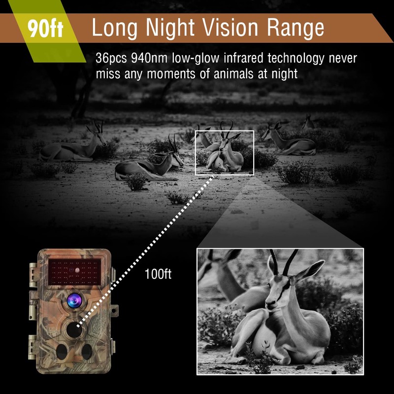• [ 120°Angle Lens ] The trail camera is equipped with 120° angle lens, which help record every breathtaking motion in wider range. Built in 36pcs high performance infrared no glow 940nm LED help recording clear video and shooting clear picture even in pitch dark night. The night vision distance up to 90ft/27m.