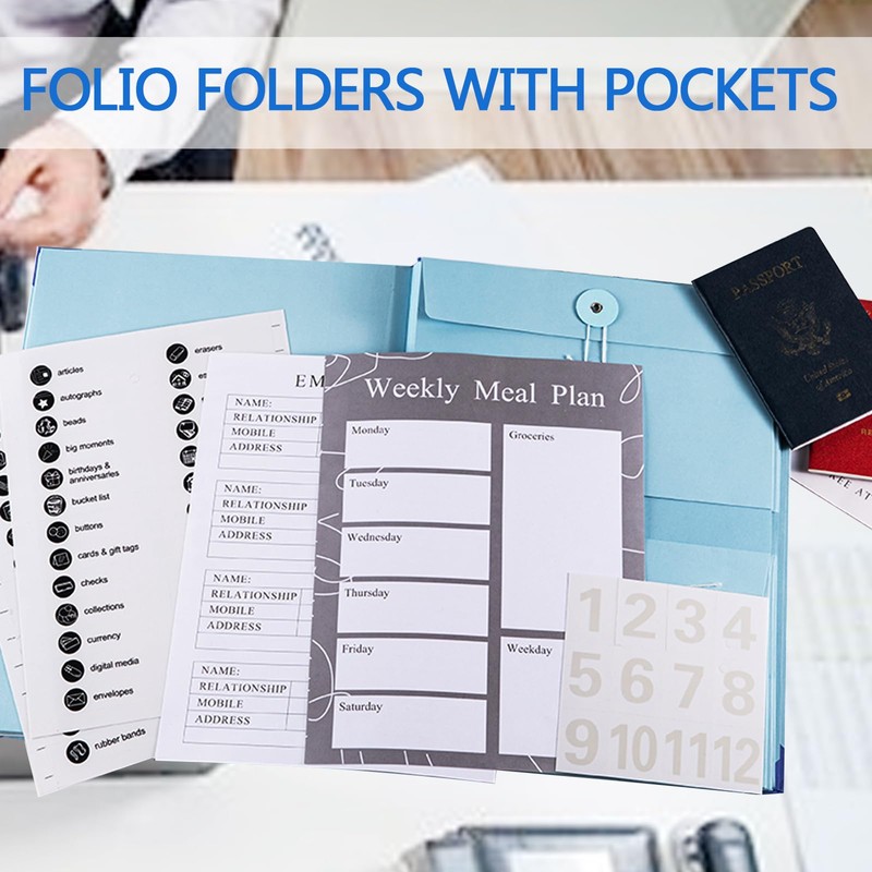 • 【Folio Folders with Pockets】The file folder is designed with expanding file folder pockets,allowing you to neatly store and categorize your important documents. Its multiple pockets provide ample space to accommodate different document sizes while minimizing clutter.