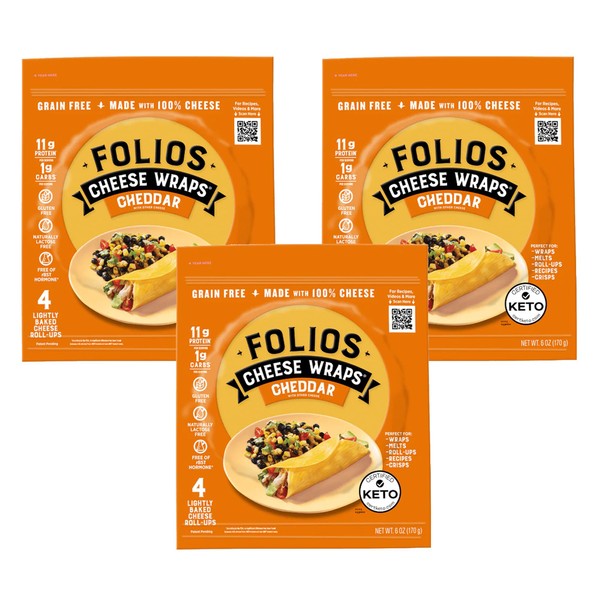 Folios 100% All Natural Cheese Wraps | Cheddar Flavor | Gluten Free, Grain Free and Naturally Lactose Free | Certified Keto | 1 gr of carbs, 3 Pack
