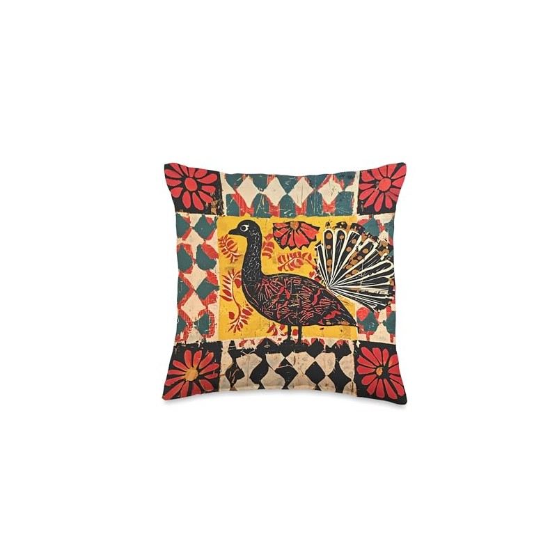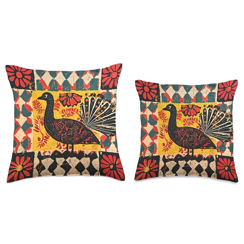 Folk Art Turkey With Fan Tail Graphic Throw Pillow