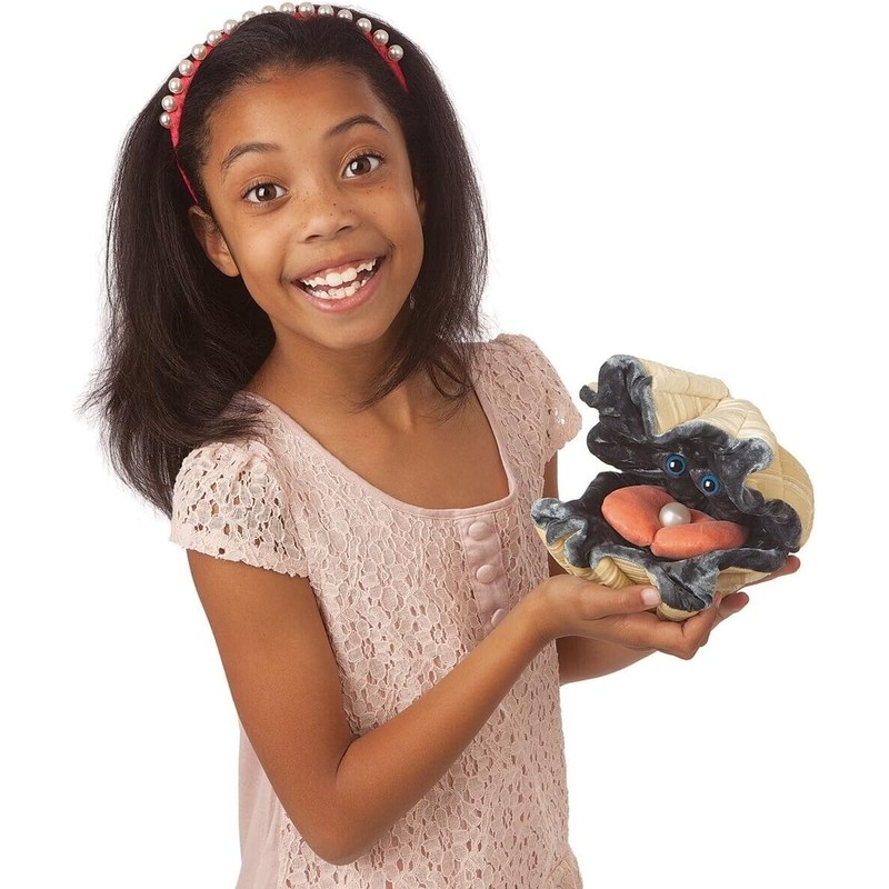 A magnificent mollusk, the Folkmanis giant clam puppet is a deep sea diver's dream come true! Inside the lovely and textural shell, behold the bounty of the sea. With four fingers, operate the clam shell and eyes to uncover a rare Pearl tucked away safely inside. This extraordinary puppet is the most fun you'll ever have with shellfish!