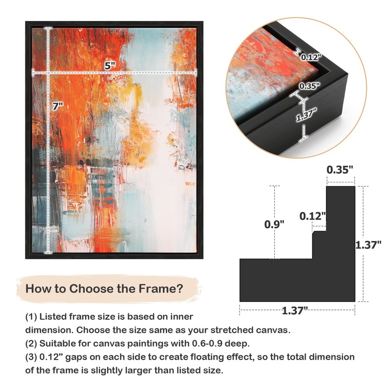 - HIGHLIGHT YOUR BELOVED ARTWORK: These floater frames are designed for artwork that is printed or painted on stretched canvas, a special framing way to give art the illusion of floating inside the frame without touching it. Rabbet depth: 0.9", work well with your 0.6-0.9" deep canvas artwork. There are 0.12” gaps on each side to create an interesting visual detail [Note: Listed sizes are based on suitable canvas painting. Empty frame included, no glass cover and backing board]