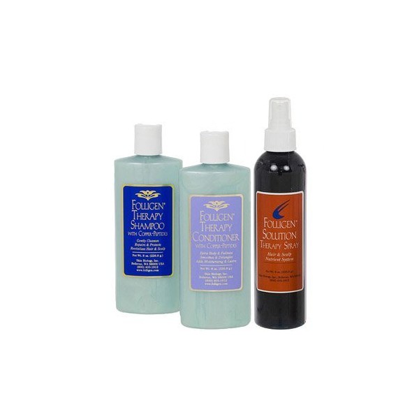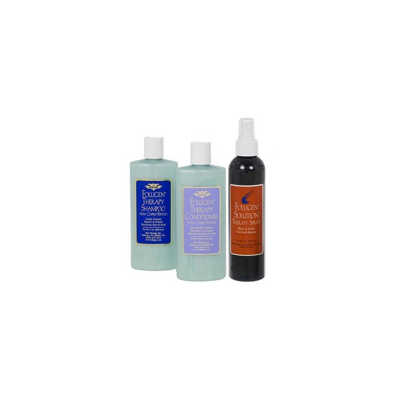Folligen Therapy Solution Spray Promises You: The original copper peptide hair formula designed by Dr. Pickart to quickly increase hair beauty and smoothness. Copper peptides really do work for hair beauty better than any other topical! Dr. Pickart previously invented the Tricomin and Graftcyte lines (highly rated haircare systems used for decades). In his opinion, Folligen is a much more effective system. Folligen Therapy Shampoo & Conditioner Combo Promises You: The only shampoo and conditioner with the highest levels of copper peptides blended with hair protective ingredients to quickly enhance hair luster and beauty from the very first use. Folligen Shampoo gently cleanses while Folligen Conditioner helps de-tangle using amino acids and pantothenic acid (vitamin B-5) to re-seal hair cuticles after shampooing. Plus, both products are fortified with superior copper peptides to keep your scalp strong and resilient!
