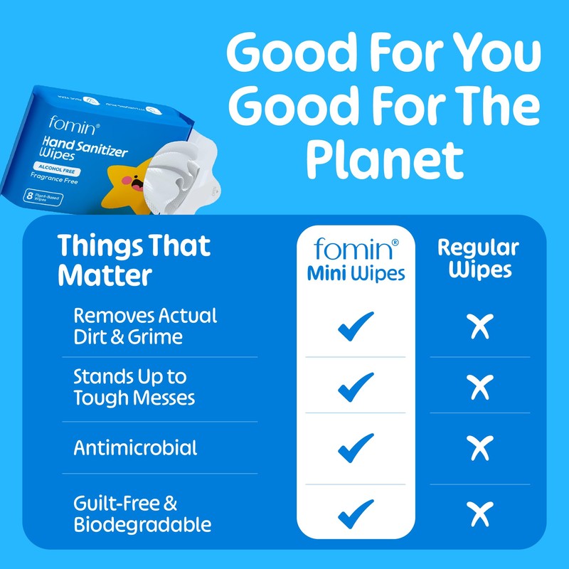 Keep little hands clean wherever life takes you with Fomin Hand Sanitizing Wipes – the perfect wet wipes travel size solution for families on the go. Each compact pack contains multiple mini wipes made from biodegradable, plant-based materials that are gentle on skin and tough on germs.