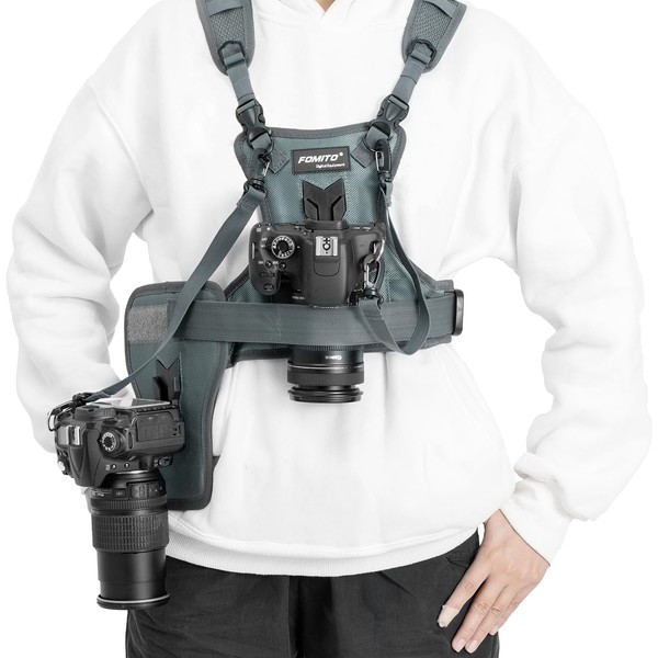 FOMITO Dual Camera Chest Harness System, Professional Photography Vest with Side Holster, Gray, Gray, One Size