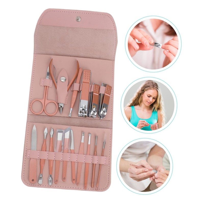- The set includes: larger nail clipper, small nail clipper, diagonal nail clipper, cuticle nipper, double-head nail cleaner, nail file, eyebrow clip, dead skin fork, scraping cutter, scissor, eyebrow knife, flat pedicure knife, diagonal pedicure knife, 2 ear spoons, nail manicure tool kit.