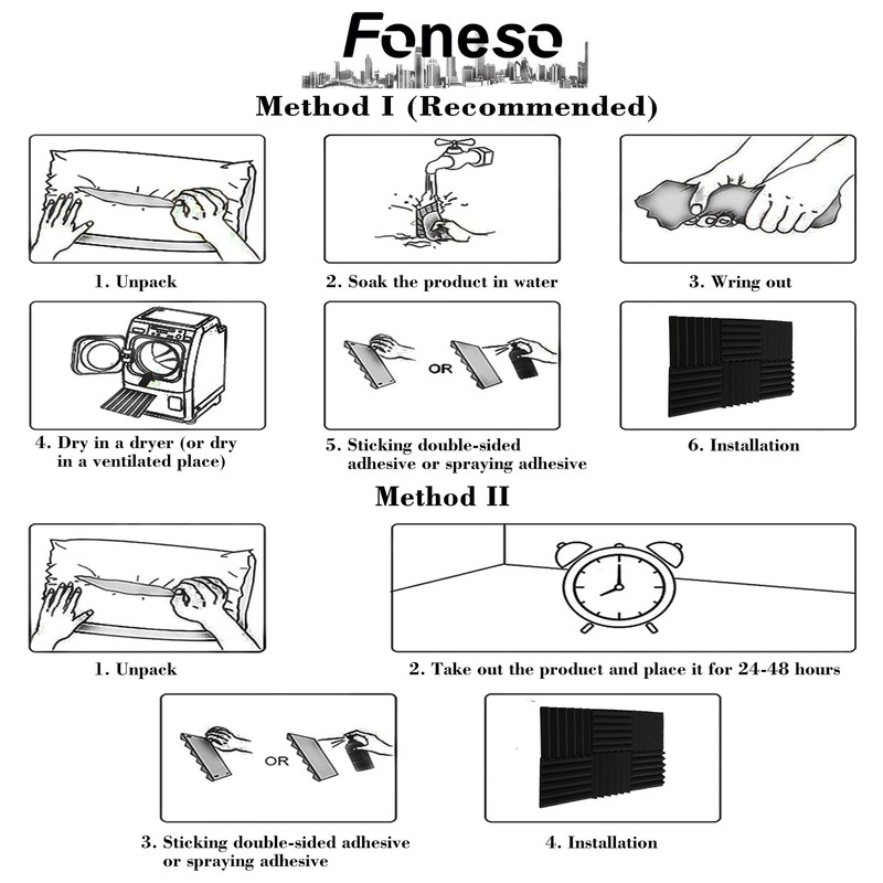 - Attention to use: acoustic foam adopts vacuum compression packaging. After opening, put it for 24-48 hours or dry it after soaking in water to restore the normal thickness.
