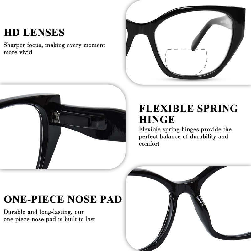 - STAY STYLISH - Go big with the FONHCOO bifocal reading glasses frame’s elegant take on the cat-eye design! These geometric frames feature oversized butterfly lenses, offering a creative yet subtle twist on the iconic shape. Exuding a classic yet edgy vibe, they’re ideal for anyone seeking standout style.