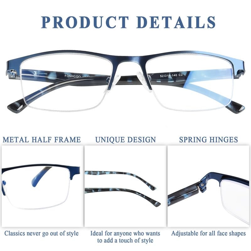 FONHCOO Bifocal Reading Glasses for Women Men, Metal Half Frame Blue Light Blocking Readers Anti UV/Glare/Eyestrain
