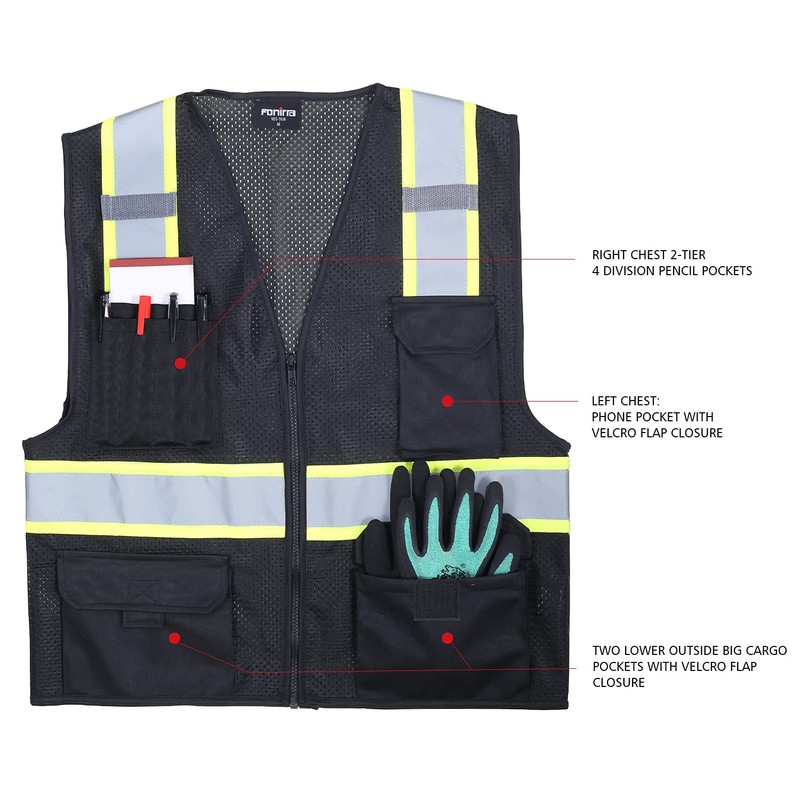 - 【MULTI-FUNCTION POCKETS】This FONIRRA safety vest comes with 8 front pockets.1 large ID Pocket,4 small pencil pockets,3 large pockets with flaps,perfect for cell phone,Mic,flashlight and business cards.