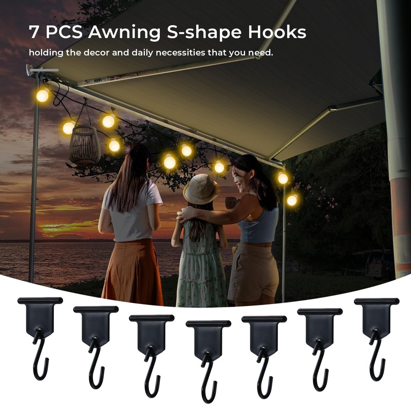 - 【READY-TO-INSTALL】Each kit includes 3 poly-cords sewn in for easy installation, RV awning tie down kits for reducing vibration in strong wind, 7.8ft RV awning pull strap for easier rolling awning out and retracting, and 7pcs S-shaped awning hooks for holding decorations and daily necessities.