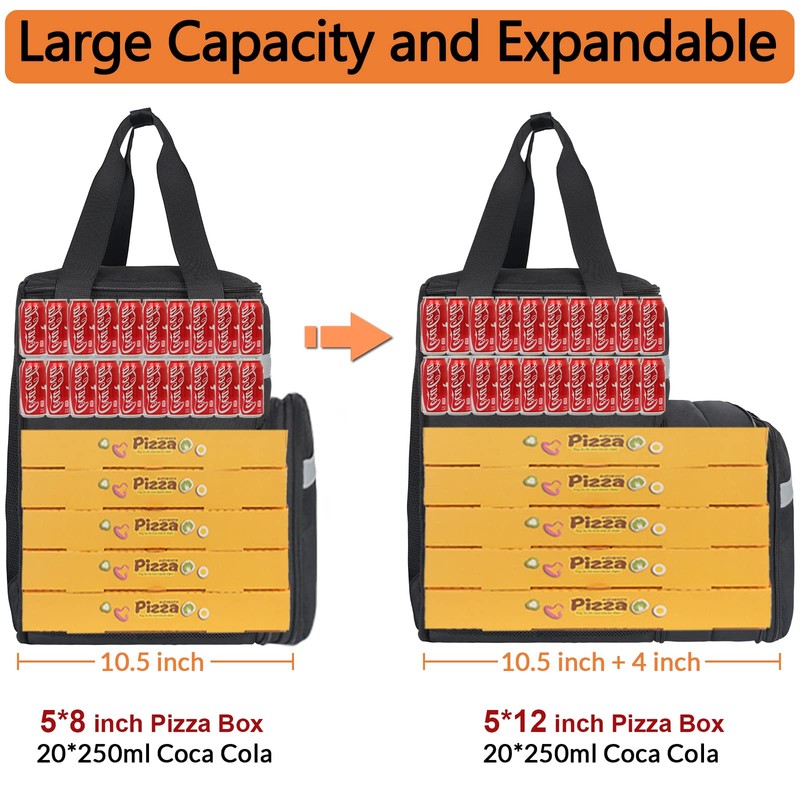 - Expandable: Food delivery bag unextended dimension(14.5Inch*10.5Inch*14Inch), expanded dimension(14.5Inch*14.5Inch*14Inch), An expandable zipper can expand an additional 4 inch on the bottom layer, providing extra capacity. Easily stack 1-5pcs 12inch pizza boxes.