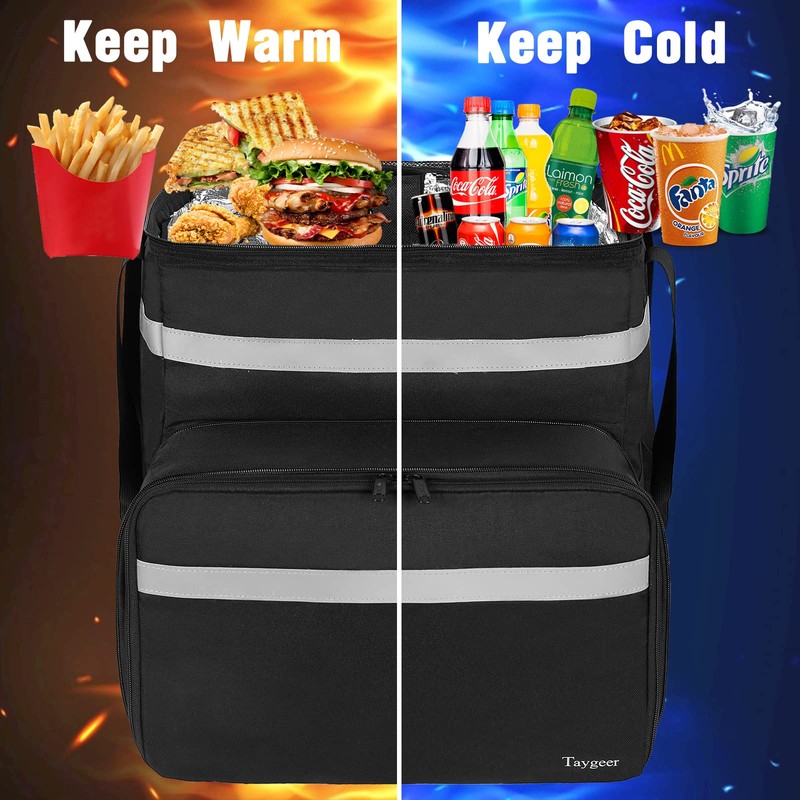 - Large Capacity: Food delivery bags are spacious enough to fit most food packages. Pizza bags for delivery for delivery fit up to a 5*12inch pizza box and 20*250ml Coca Cola, Hamburger, sandwiches, beers, snacks etc. Bike delivery backpack folds up flat when not in use for storage. Two Layered designs for more orderly placement of food