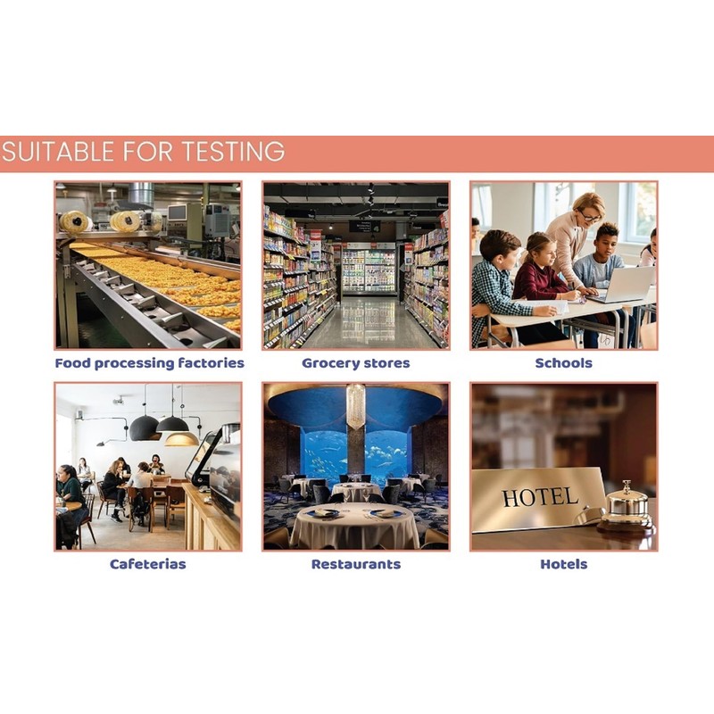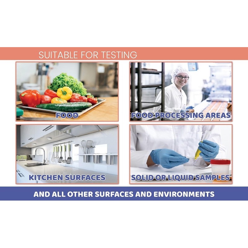 - Suitable for testing foods, food processing areas, farm environments, solid or liquid samples, all surfaces and environments.