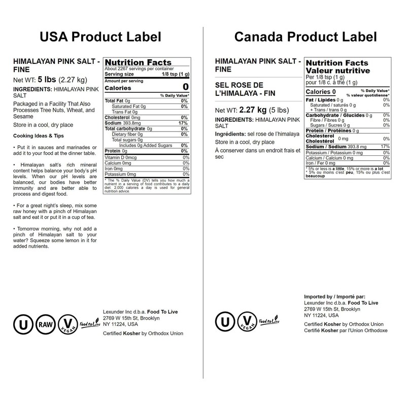 Food to Live Himalayan Pink Salt, 5 Pounds – Fine Grind, Pure, No Additives, No Preservatives, Vegan, Kosher, Bulk. Basic Seasonings. Packed with Minerals. Great for Cooking, Baking, Salt Shakers.