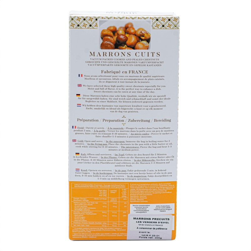 - Elegant chestnuts from France, which are carefully selected, gently cooked and then vacuum packed.