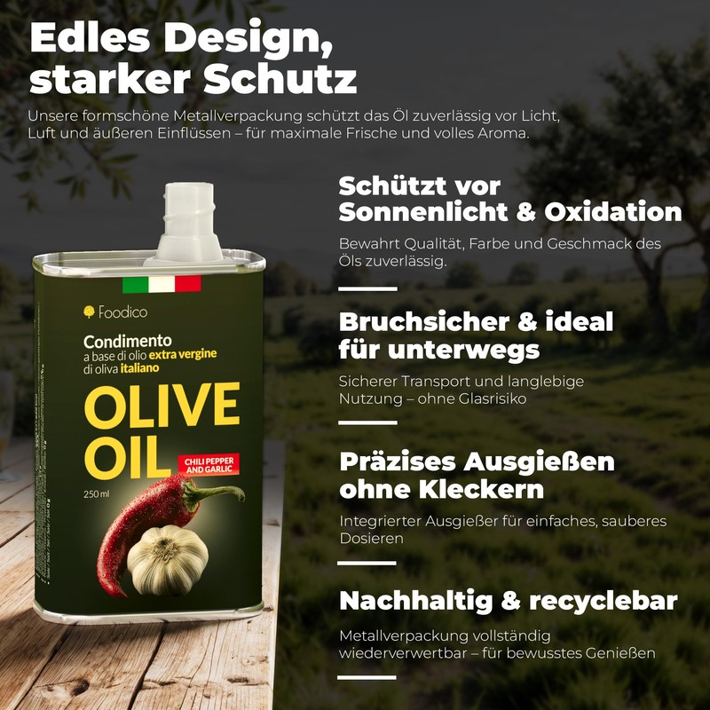 - ✅ Mediterrane Würze mit Charakter – natürliches Aroma von Chili & Knoblauch trifft auf kaltgepresstes, extra natives Olivenöl aus Italien