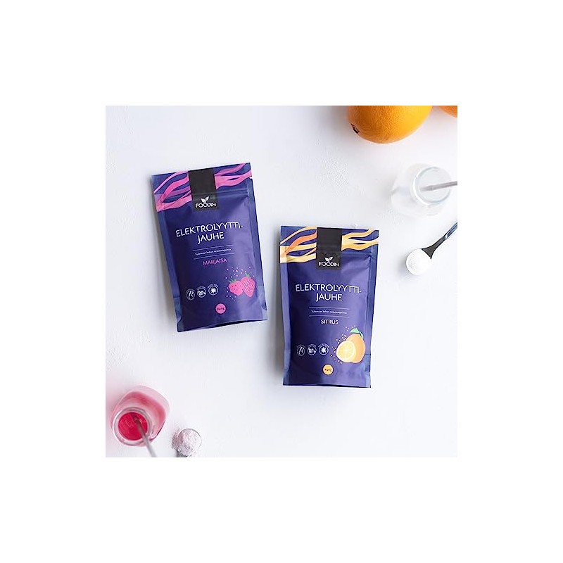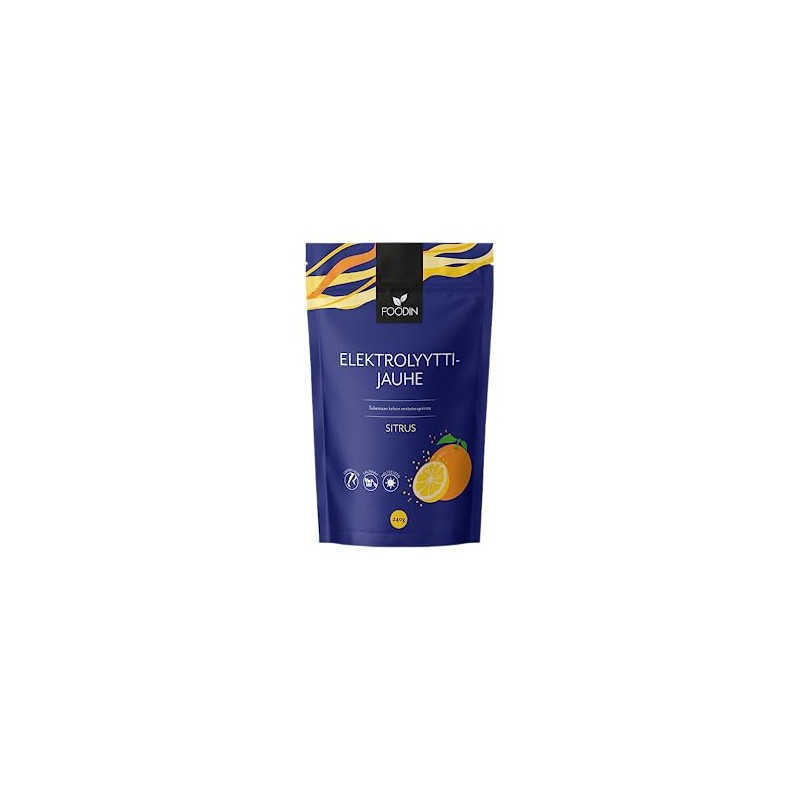 Easy to use and good tasting electrolyte powder for optimal liquid balance. Foodin's electrolyte powder Sitrus is a practical dietary supplement to support an optimal fluid balance. The fresh electrolyte powder Sitrus tastes like a charming combination of lemon and orange. The electrolyte powder contains a high-quality CelticSea Salt trace element blend and AquaminF algae extract as well as OptiMSM powder, vitamin C and Guérande sea salt. Electrolyte powder is suitable for use during sweating (sauna, sports, heat) when you need fresh hydration or want to support the increased need for electrolytes due to a ketogenic diet. In addition to water, try the powder mixed with coconut water or mineral water - the result is a delicious hydration drink that you will enjoy several times a day!"