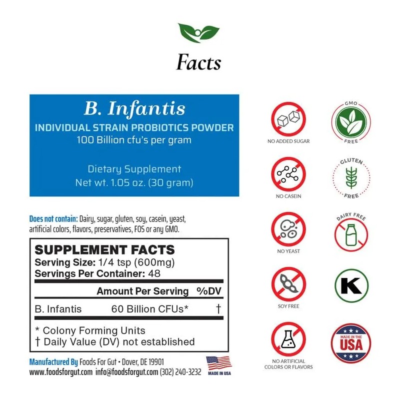 - Ingredientes: Bifidobacterium Infantis (B. Infantis). Sin otros ingredientes ni aditivos.