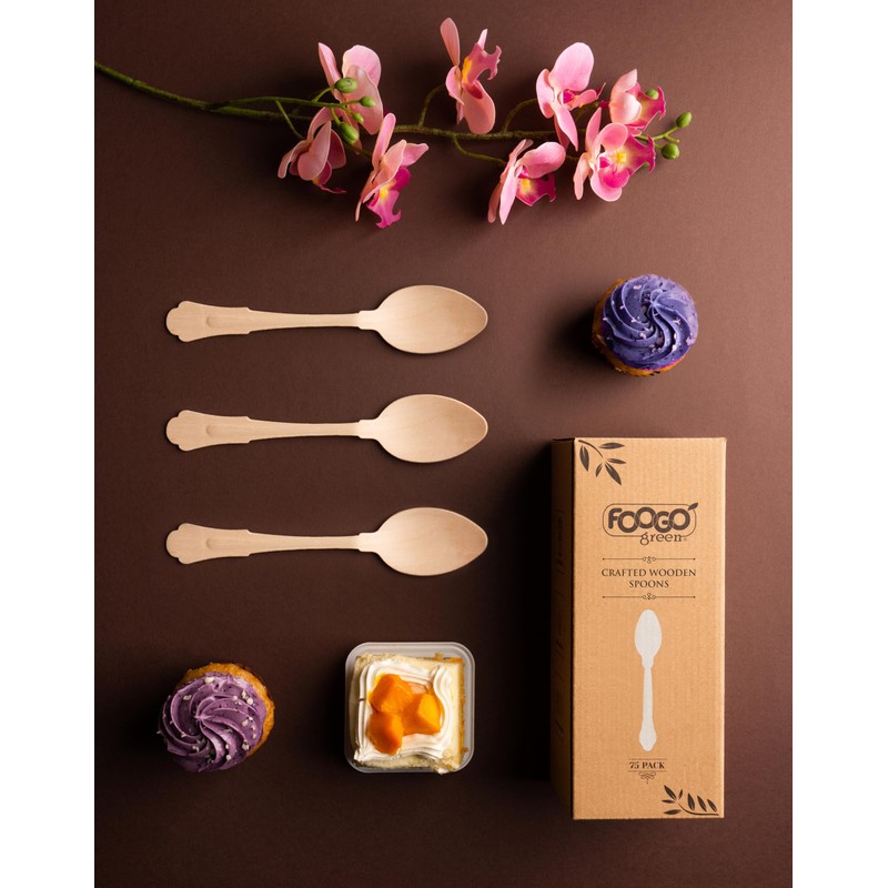 FOOGO Green 100pcs Elegant Disposable Wooden Spoons, FSC® Certified, 100x Spoons, 20cm, Biodegradable Eco Friendly Cutlery Set, Ideal for Weddings, Bamboo, Alternative to Plastic