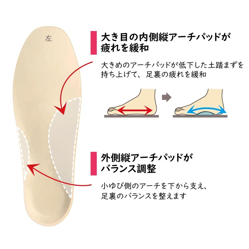 The biggest cause of flat feet is "fall in the inner vertical arch". Therefore, there is a pad that supports the "inner vertical arch" in the arch.
