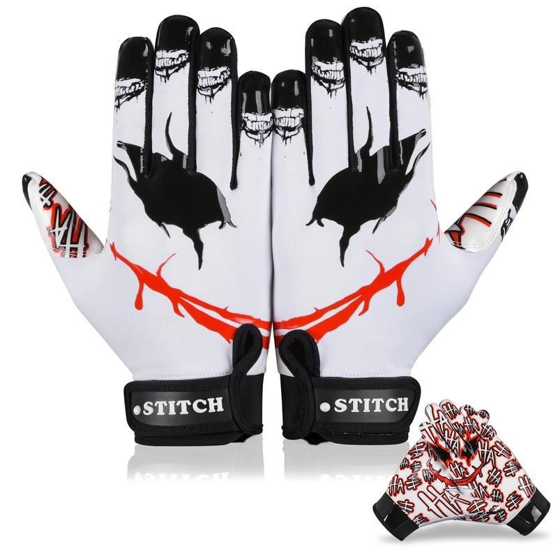- ☆ Heavy Duty Sticky Silicone Grip : Dot Stitch Jester football receiver gloves are designed with heavy duty sticky silicone grip which provides extra grip while playing game and moreover super perfect for nonslip. Back side joker face silicone print design on comfortable and stretchable material.