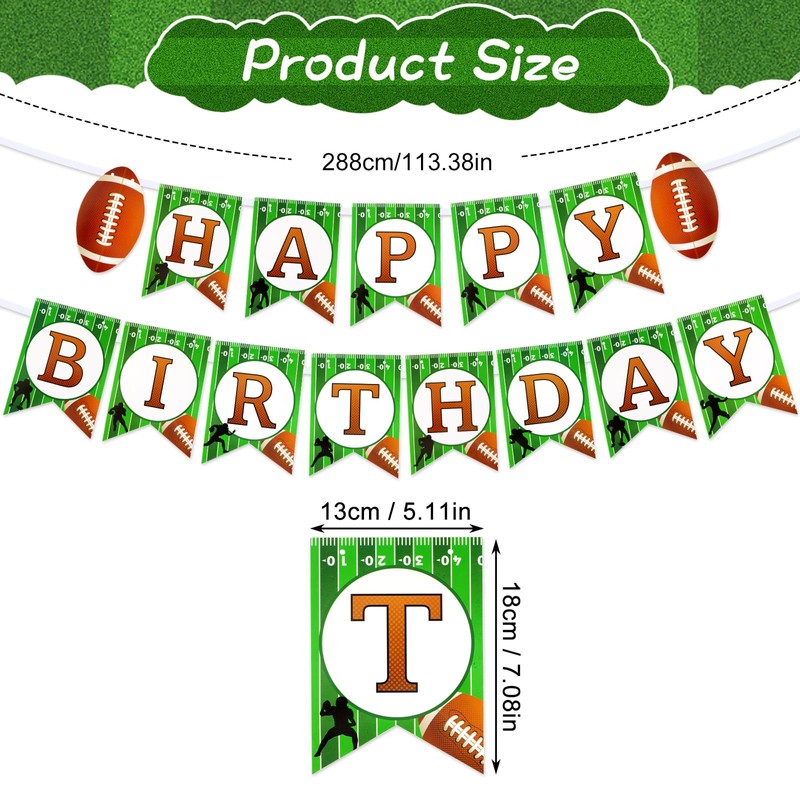 - 【Proper Flag Size】Size of the green football theme flag is approx. 7*5inch/18*13cm, with brown happy birthday on white circles; Length of the banner string is approx. 295cm/116inch, you can cut to any size you want to increase your football birthday party with these football themed banner sets.