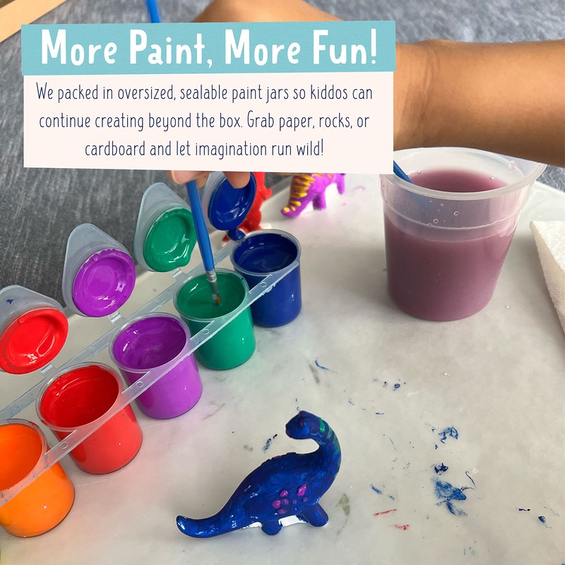- Paint that lasts – We include an abundance of washable, high-quality paint because we know kids like to be creative! We added larger, sealable paint jars to encourage additional paint projects. Grab some rocks, a cardboard box, or plain paper and use the extra paint and brushes provided to encourage supplemental projects.