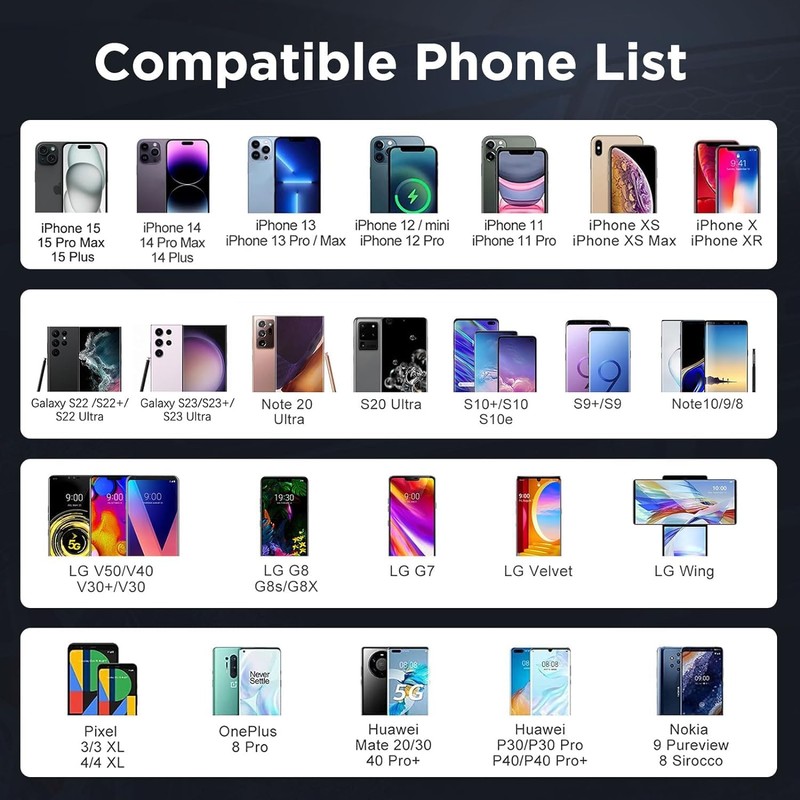- High-Speed Dynamic Charging: With a maximum power output of 15W, QXZcar wireless charger can charge your devices quickly and efficiently. Optimized chipset provides 15W charging on LG phones, 10W charging on Samsung, and 7.5W charging on iPhones; and 5W for other phones or wireless earbuds (including AirPods).