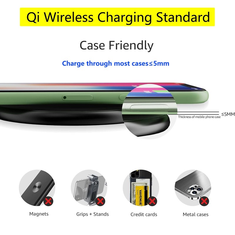- Case Friendly: Transmits power through most protective cases (rubber/plastic/TPU cases under 5mm thickness ONLY). For faster charging with iPhone remove all cases before charging. Avoid charging with magnetic and metal cases or credit cards on; these cases will prevent qi wireless charging operation.