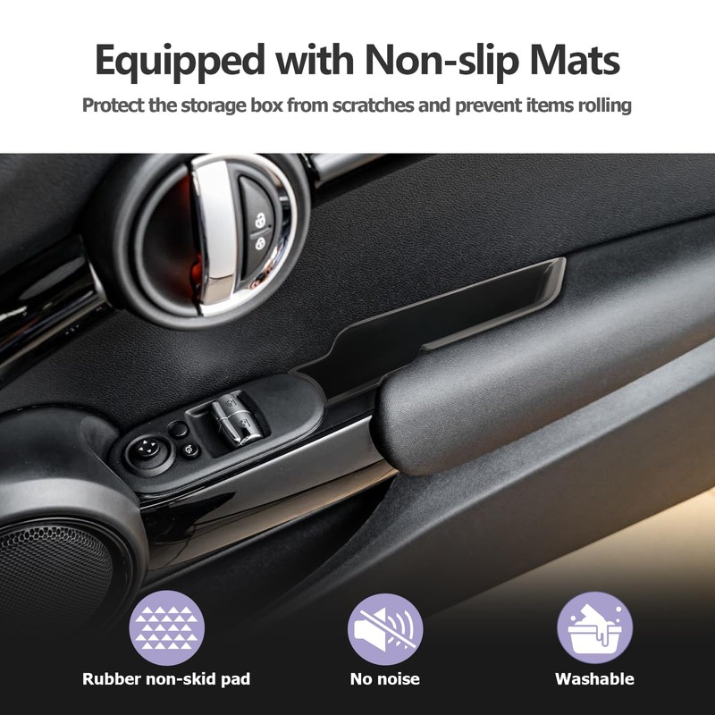 - [Installation in minutes] The mini cooper organizer,mini cooper s accessories,mini cooper door storage, mini cooper f56 phone container key holder tray storage box by the door can be installed and disassembled quickly and conveniently without wasting the car door space, beautiful and practical, and no longer messy,2025 mini cooper accessories