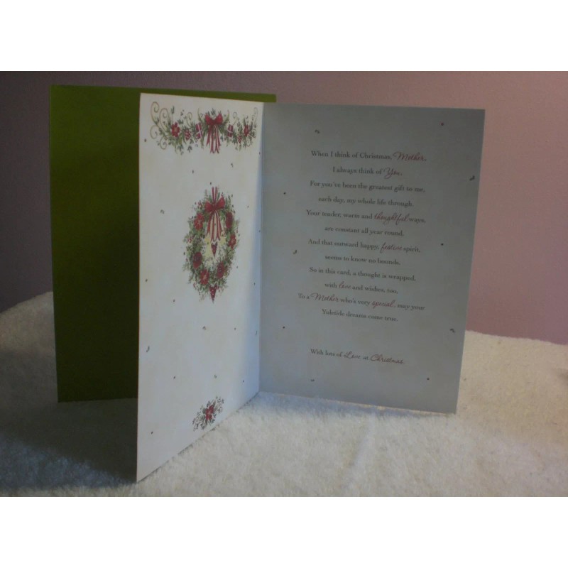 A beautiful wreath with the sentiment, "Merry Christmas wishes To a Wonderful Mother. With Love at this Special Festive Time" on the front, "When I think of Christmas, Mother, I always think of you. For you've been the greatest gift to me, each day, my whole life through. Your tender, warm and thoughtful ways, are constant all year round, And that outward happy, festive spirit, seems to know no bounds. So in this card, a thought is wrapped, with love and wishes, too, To a Mother who's very special, may your Yuletide dearms come true. With lots of Love at Christmas." on the inside. The envelope is green. So why run to the store at the last minute to get those special Christmas cards, that you can never find, why not get them at my eBay store. These are beautiful cards are by a company For Arts Sake. These cards are great Christmas cards to send a friend or family, or to frame. These are unique and wonderful cards that are new, never been used. Look at the other cards in my store. Pick out several and I will send them in one small package that saves you both; time and money. I do combined shipping on all my items in my eBay store. |