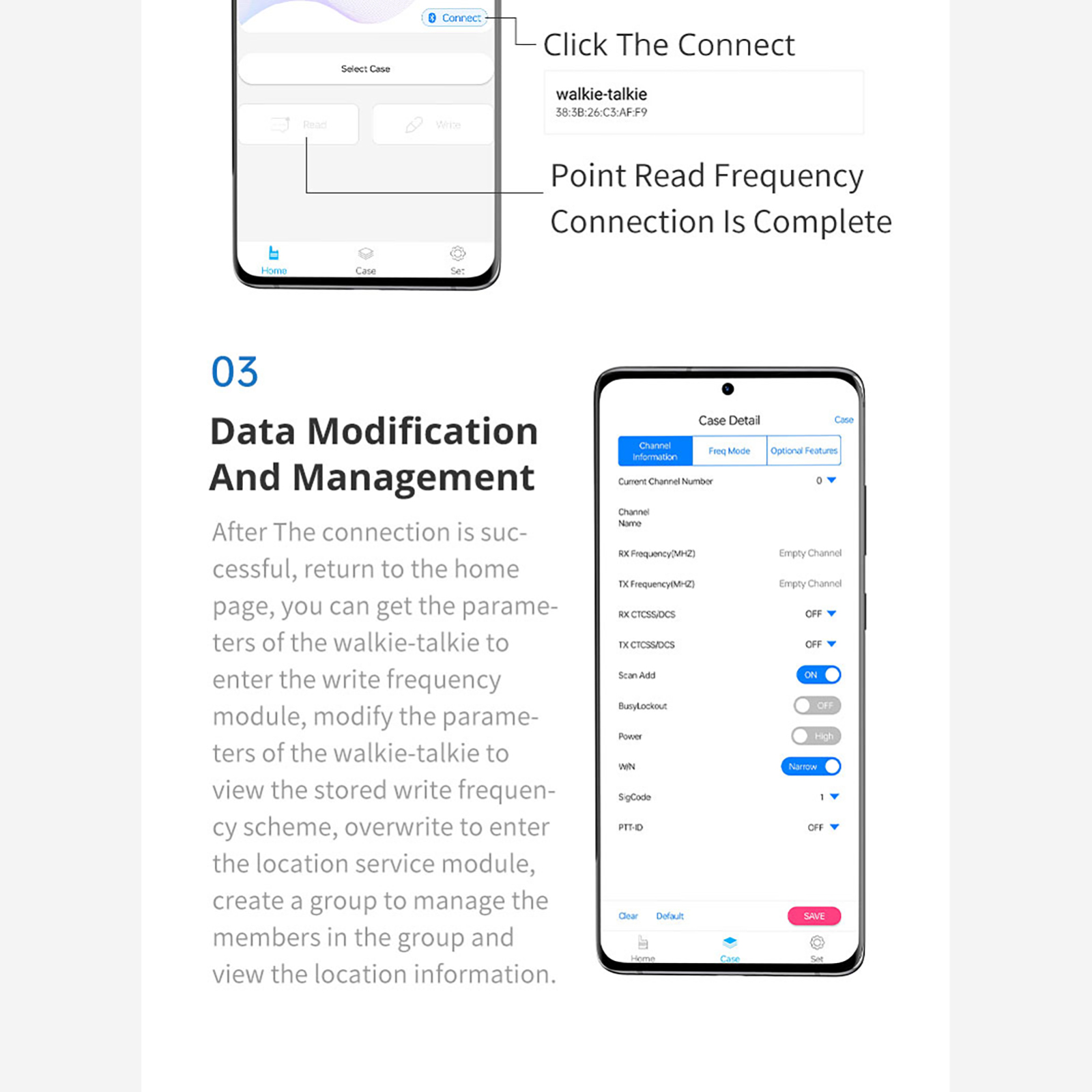 Program the radio with your phone anytime, anywhere, without the need to install drivers. Use a single mobile application to program multiple radio models, save and share configuration files.